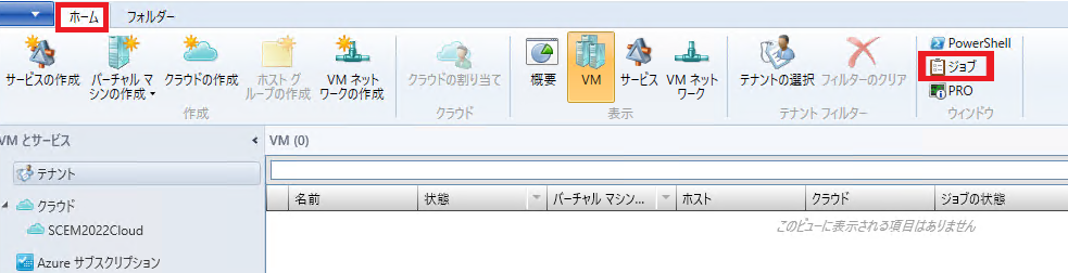 | 2 | ジョブ一覧 | SCVMM のジョブが正常終了しなかった場合、ジョブ一覧にて実行ジョブの名称、実行時間、発生したエラーなどを確認します。 |