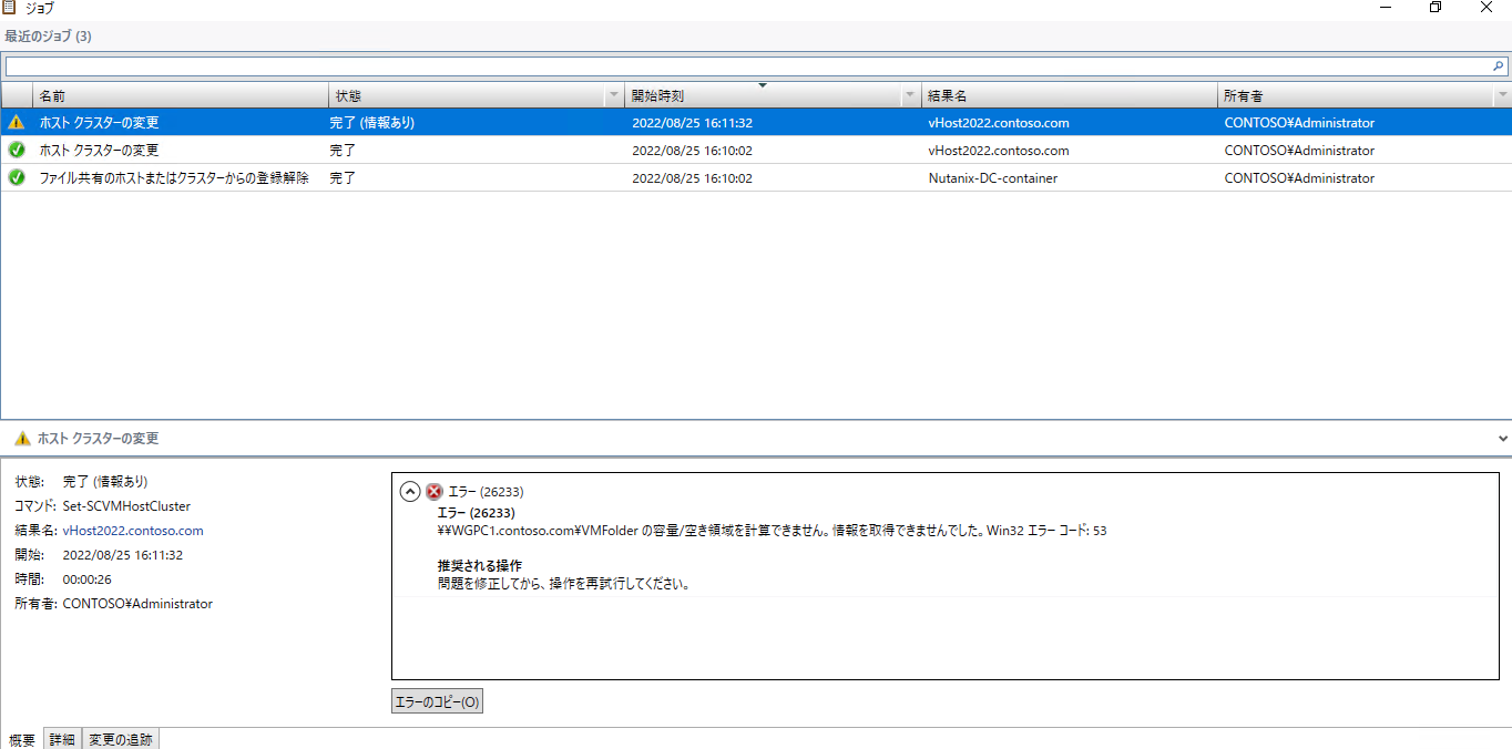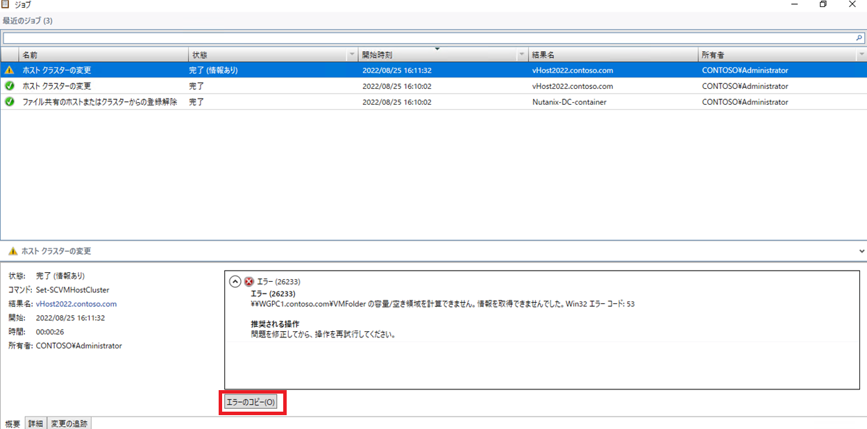 SCVMM で実行したジョブが正常終了しなかった場合、ジョブ一覧を確認することで、実行したジョブと発生したエラー、エラーメッセージが確認できます。